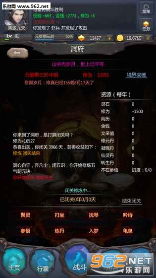 你拥有自己的洞府可以进行打坐,布下阵法聚灵,可以炼丹,还可以吟诗作赋,抚琴等。