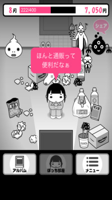 自闭女孩破解版采用简约的黑白胶片游戏画风,看名字也许会感觉到压抑,但是游戏玩起来却是非常有趣的,在这里你将要和小女孩一起来收集垃圾,将房间整理干净,收集更多的杂物、垃圾,来获取更高的得分。