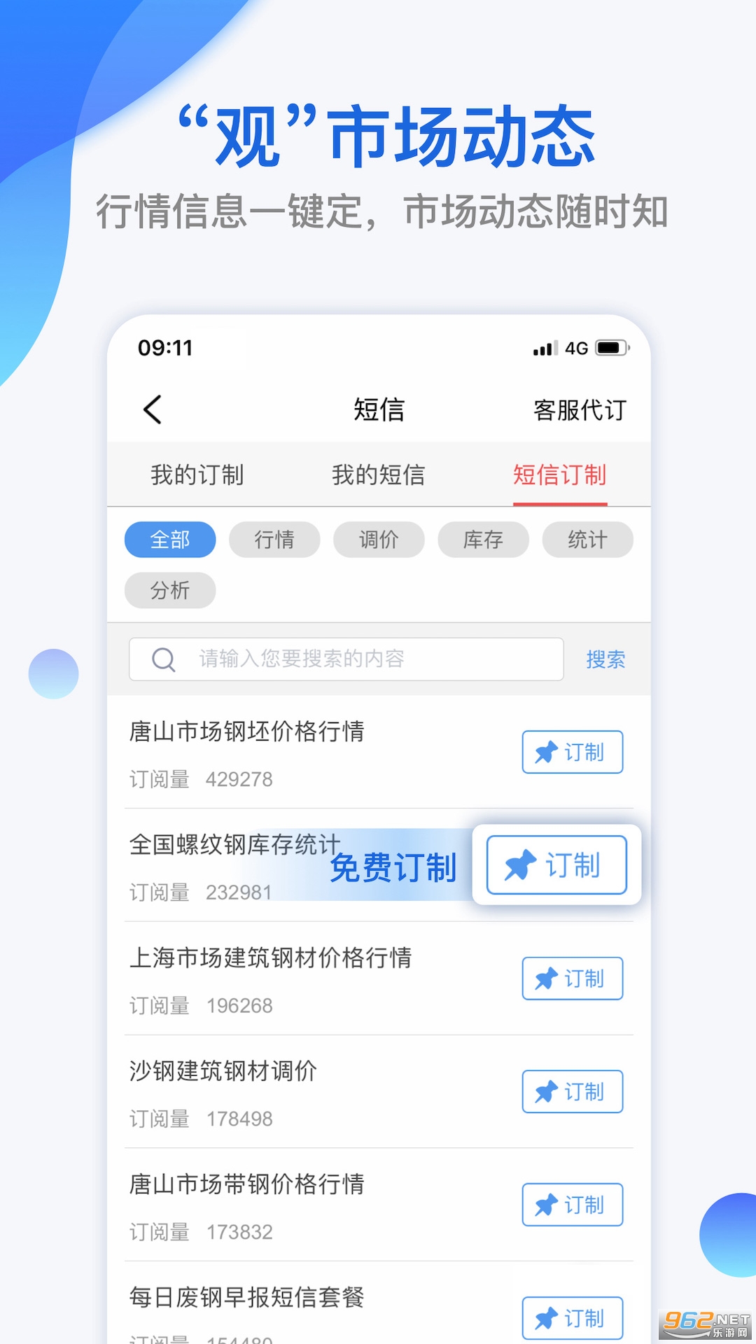 即时短信:丰富信息一键定制,市场行情、钢厂调价、调查统计等信息即时推送,商机与您不期而遇;