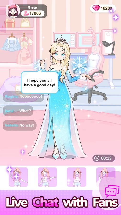 准备好你的甜蜜公主娃娃,打扮好后在直播室里闪闪发光! 通过互动直播体验超级偶像的生活,赢得粉丝的喜爱,成为万众瞩目的直播明星偶像。