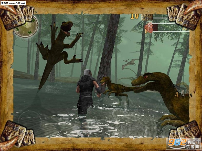这款游戏中,你已经归隐山林了,可是你发现过的有点太无聊了,你将来到侏罗纪进行各种恐龙猎杀行动,当然你还会收到它们的攻击,能否杀掉它们就看你能耐了!你的装备就是摩托车和来福枪。准备好进行一场犀利而惊心动魄的战斗了么。各种恐龙在等待你。