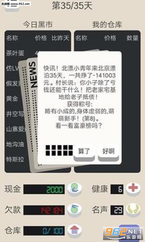 您扮演一位从外地到北京谋生的青年。一开始,您只有2000元钱,并且还欠村长(一个流氓头子)5500元 债务。这些债务每天的利息高达10%。如果不及时还清,村长会叫在北京的老乡们来扁您,您可能牺牲在北京街头。