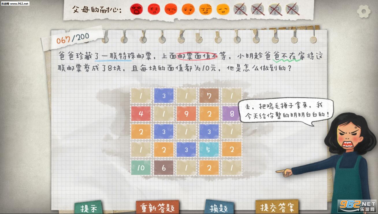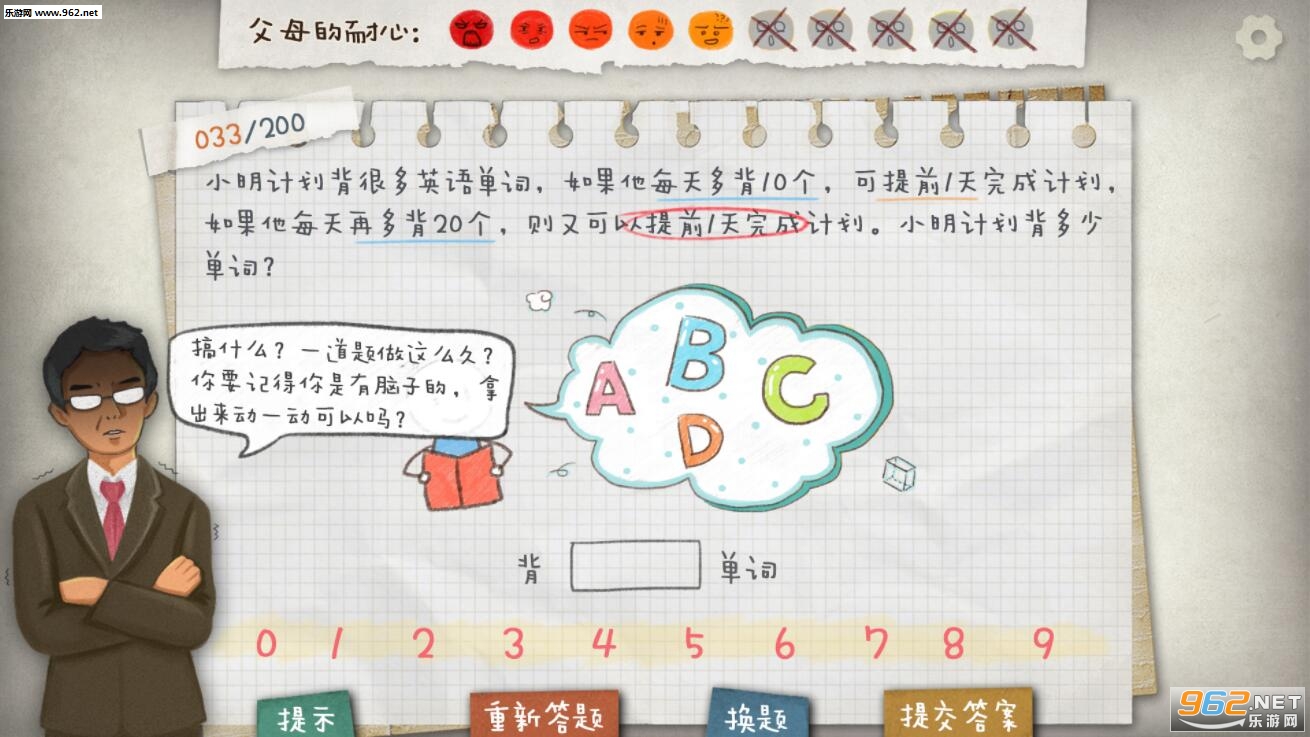 这是一个模拟中国小学生数学作业的游戏,收集了大量的小学数学难题,能让你亲身体验一下爹妈陪孩子写作业时那种亲情崩塌的刺激感。