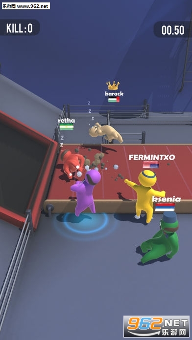 1、玩家与玩家之间的激情碰撞,基于物理现实的趣味大乱斗,将对手打晕然后扔出场去;