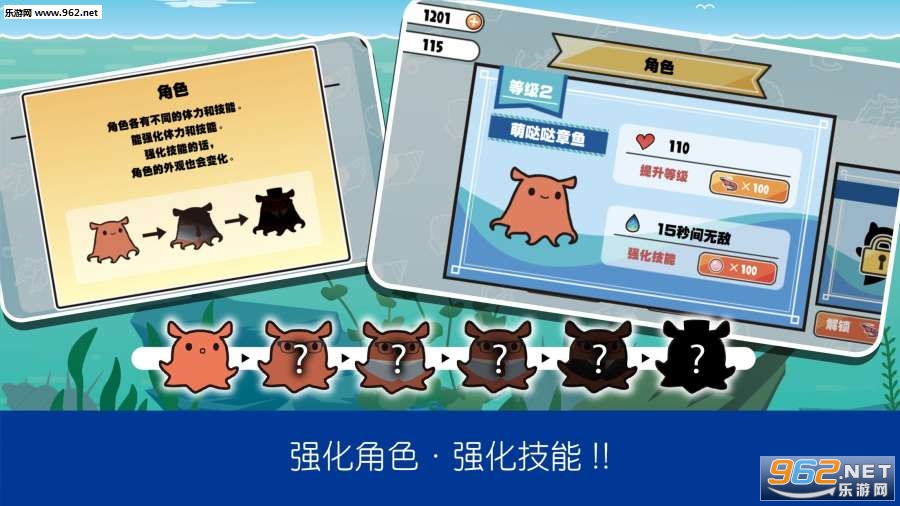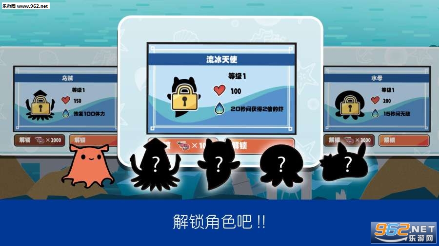 除了游戏初期的角色萌哒哒章鱼以外,还有很多拥有各种技能的可爱角色。根据角色的不同,技能的种类和强度,基础体力也不同。可以使用在游戏中获得的虾,解锁隐藏的角色吧!