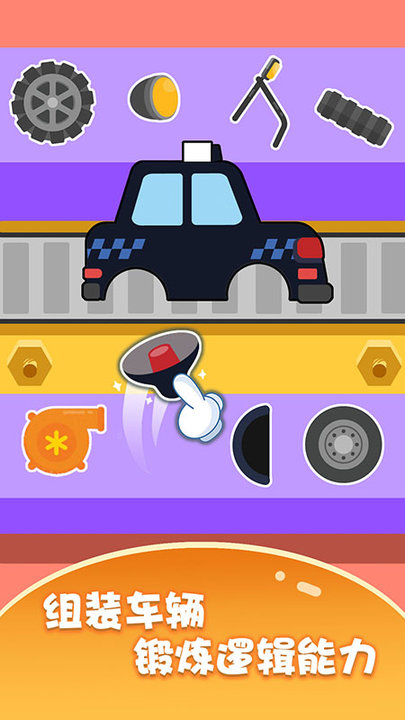 2.提供了警车,挖掘机,救护车,校车等多款车辆的拼装和使用场景模拟。