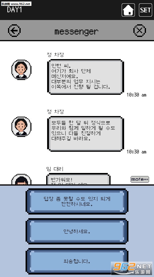 Messenger syndrome是一款韩文游戏(也有日文),因为总体说来算是一款文字类游戏,大篇幅的纯韩文还是让很多玩家望而却步的,这里建议大家等一波中文版。像素风,整体来说游戏素质较高,采用了对话的模式进行故事发展,开始我们是扮演了一个公司的小职员,通过messenger与客户(同事)们沟通交流,如果选错答案,随时可能一击毙命瞬间死亡,这里小编在第一回合就死了无数次,简直是对我这个不懂韩文的小玩家疯狂打击。