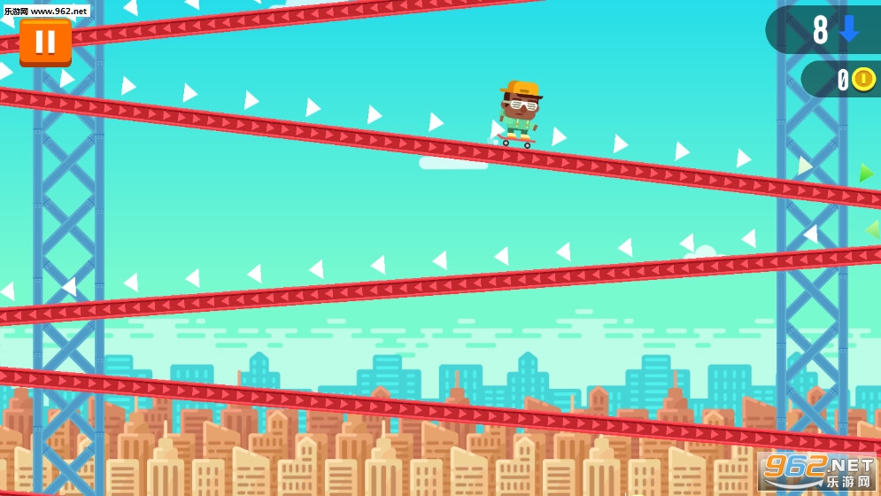 《速降滑板安卓版》(Tap Skaters)是一款画面清新的滑板快速下降类趣味休闲手游,游戏中玩家将控制一个小人脚踩滑板从一个个平台上面向下落去,点击一下屏幕人物就下落一层,注意有的平台上面有着各种障碍物,碰到就死了。
