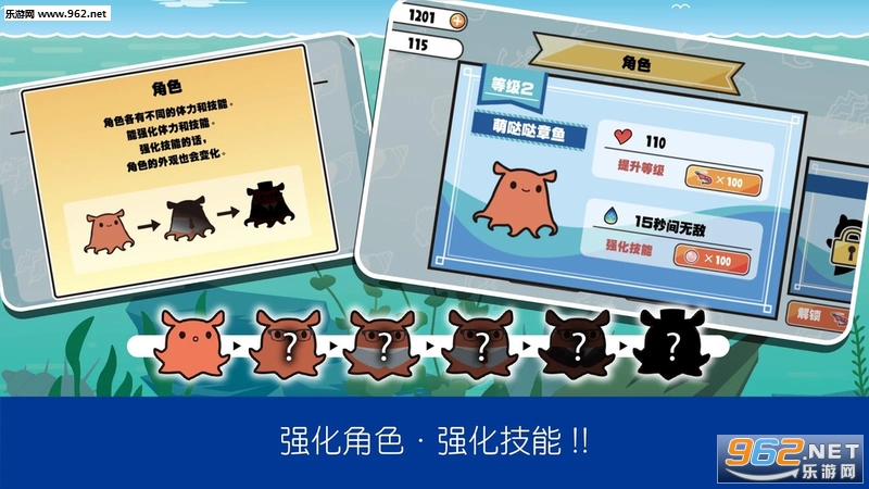 除了游戏初期的角色萌哒哒章鱼以外,还有很多拥有各种技能的可爱角色。根据角色的不同,技能的种类和强度,基础体力也不同。可以使用在游戏中获得的虾,解锁隐藏的角色吧!