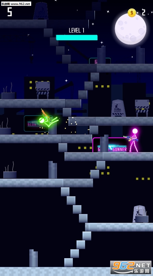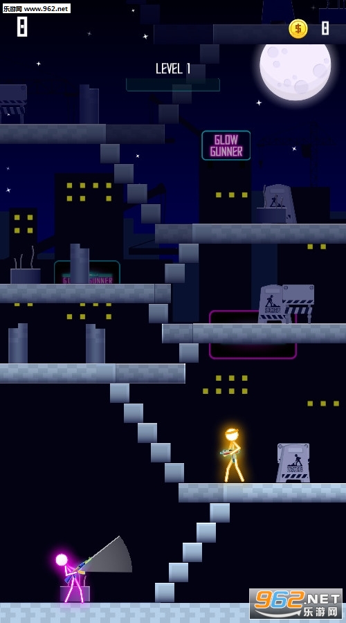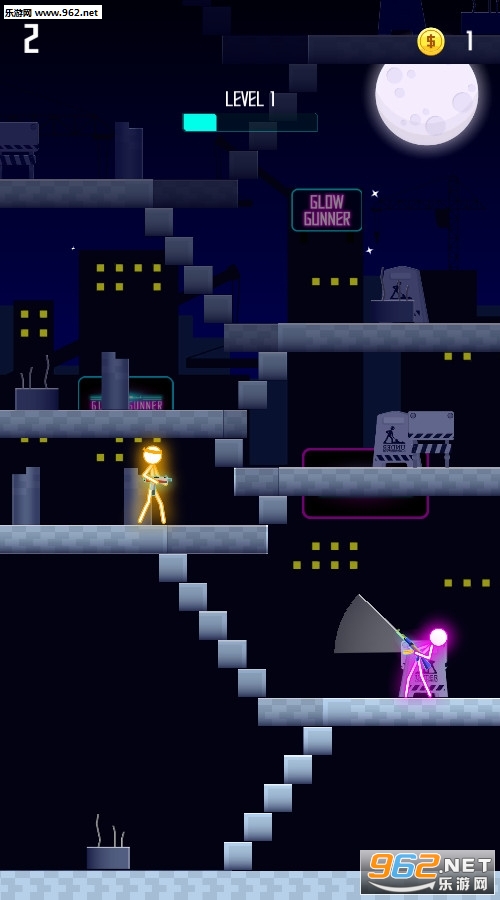 《霓虹枪手官方版》是一款十分好玩有趣的卡通2D风格休闲射击类游戏。在游戏中玩家需要扮演一位霓虹小人不断的向一个塔顶攀爬,但是每一层的塔顶都有着一个守卫者,玩家在游戏中需要控制你的小人射杀守卫者才能够前进。感兴趣的小伙伴儿赶快来下载试试吧!