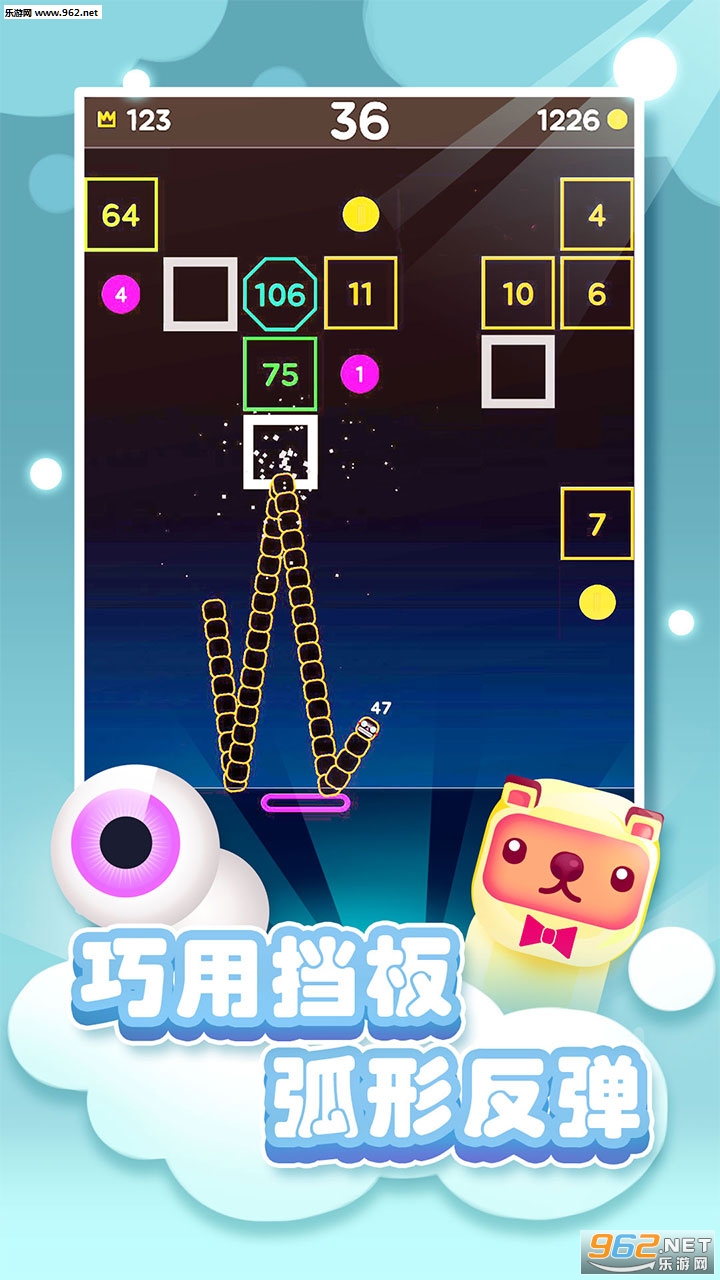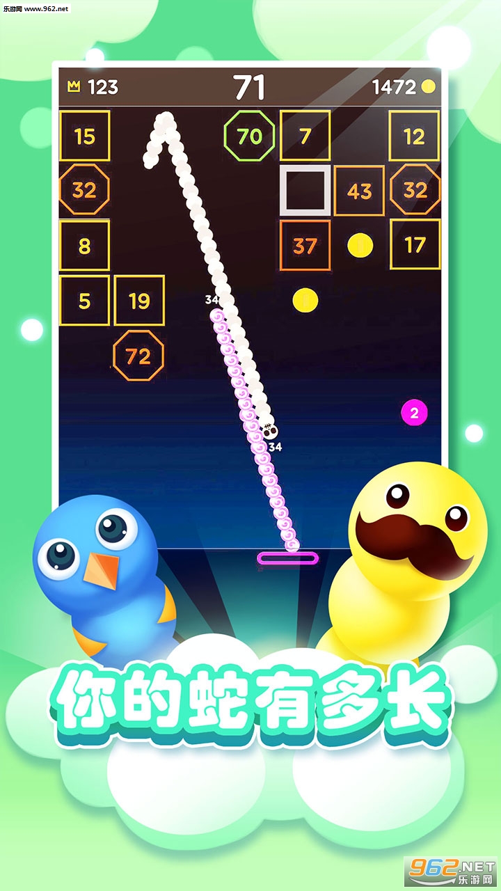 趣味的竞技闯关游戏,游戏将贪吃蛇和打砖块元素相结合,玩家通过反弹贪吃蛇来击打上面的方块,当方块数字变为零时即可击碎,有着众多的关卡可以挑战,适合闲暇时玩。