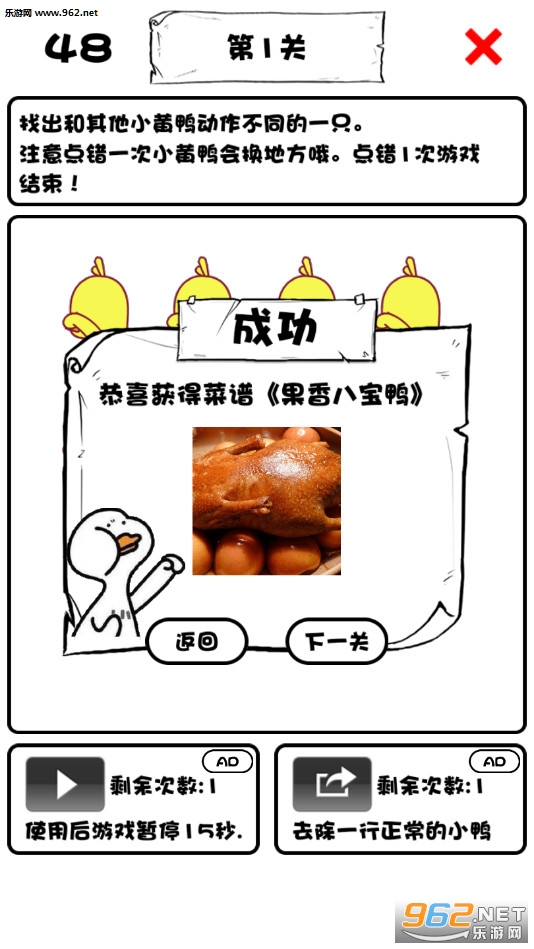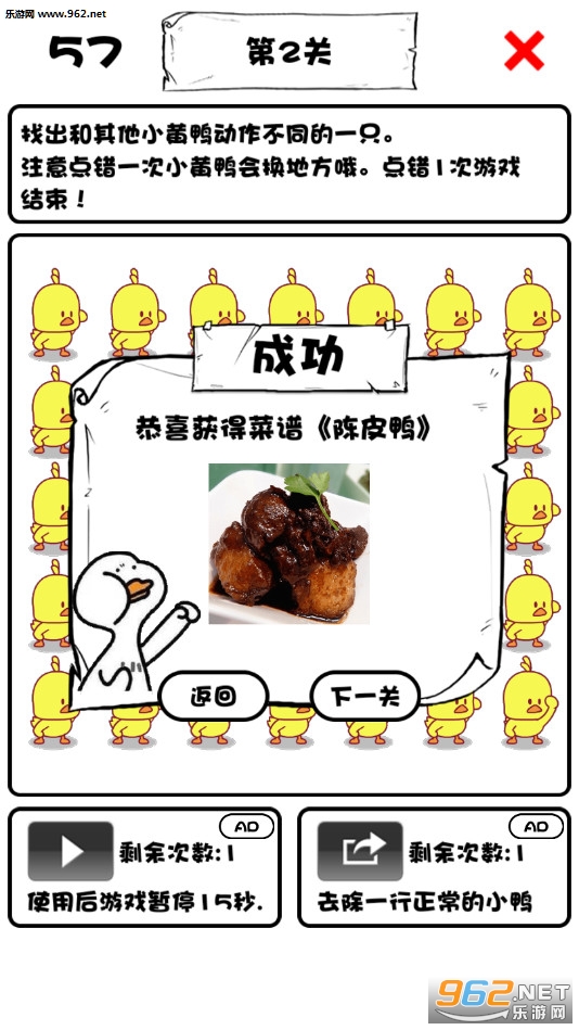 3、新的关卡就是新的挑战,努力完成更多的关卡,收集更多的鸭子食谱,了解更多的美食做法。
