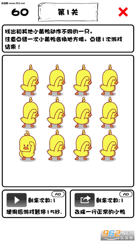 1、在关卡中,需用敏锐的洞察力,找到不一样的鸭子,完成对应的任务就可以通过闯关。