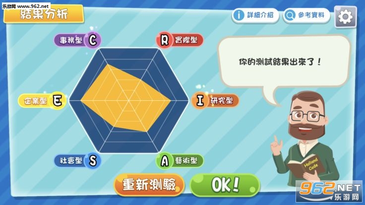 有别于传统上利用问卷调查的形式进行职业性格测试,本游戏以全新的游戏对答形式让玩家了解自己的职业性格,过程更加轻松、有趣,而且省时。