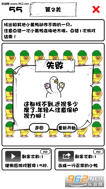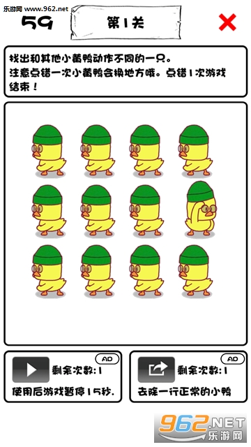 关卡中会有很多只小黄鸭,你需要找出动作不一样的一只,如果感觉有难度的话,可以使用下方的道具!