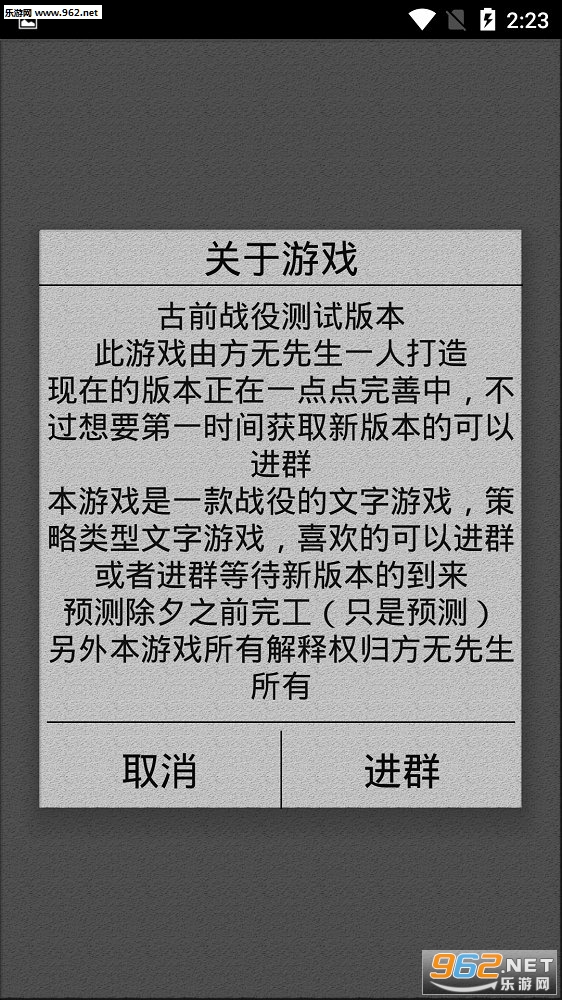 可玩性还不错的一款文字模拟游戏,总体来说模拟的方面还是非常全面的,完美的模拟了古代社会国家的发展以及战斗的过程,玩腻了华丽的策略游戏,偶尔来尝试下这种文字类的也不错呢。