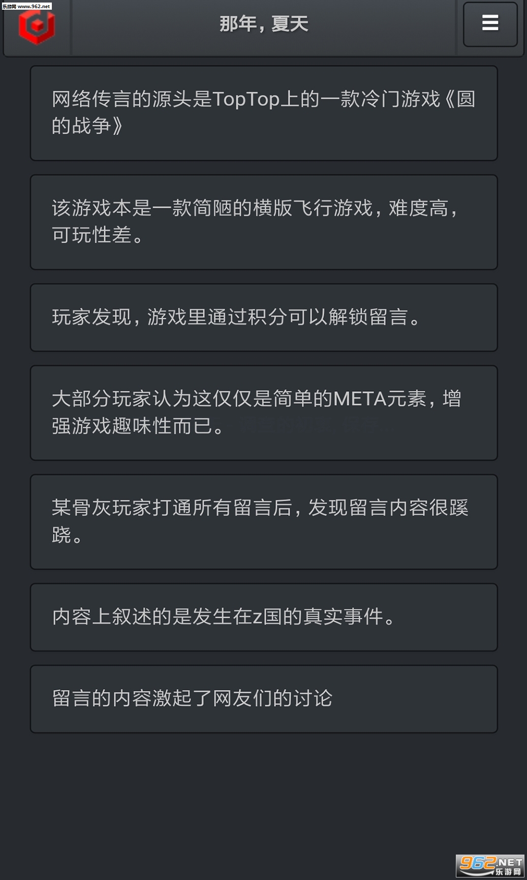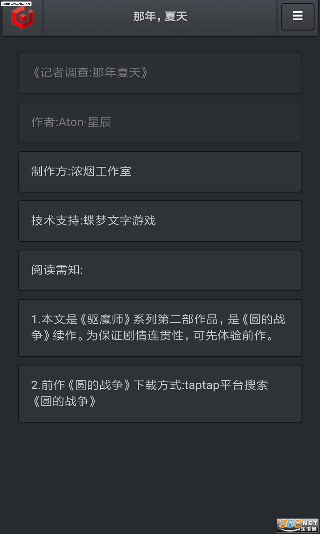 《记者调查那年夏天手游》是一款以文字玩法为核心的剧情向休闲手游,承接《圆的战争》,玩家在精彩的剧情中自己进行走访和探查,揭开事件被隐瞒的真相。玩家在游戏中看到的其实就是记者的文字直播日志,感兴趣的话就快来下载试玩吧!