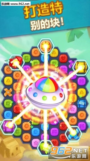 在蜂巢型的游戏板上进行六个方向的六边形方块消除游戏!