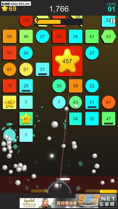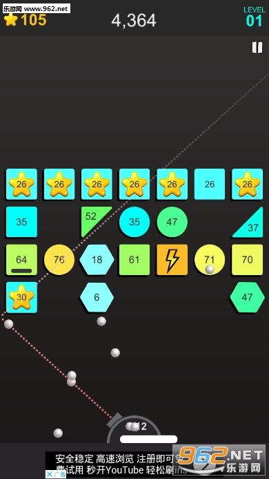 获得星星和升级第一,强力球,棒的长度和球的数量。