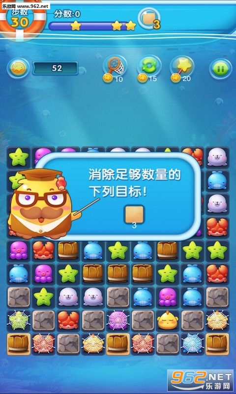 海洋消消乐是一款休闲趣味消除类游戏,采用可爱Q萌的海洋生物为主要角色,精心设计的众多不同难度关卡,通过滑动屏幕交换小鱼使3个或3个以上的横向或者纵向相同小鱼即可消除得分,海洋消消乐还可以解锁众多道具助你一臂之力。