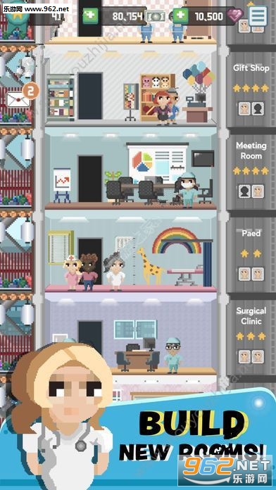 设计,管理和定制您的医院!!你梦想过建医院吗??当你设计、管理和定制你的医院时,用这个无穷无尽的医院建设模拟游戏从头开始建立你自己的医院!为您的员工和患者建造各种医疗设施、消费室以及多功能房!从咨询诊所,诊断室,面包店,书店,甚至便利店!通过升级房间来获得家具和增加房间统计!升级的房间让你有能力赚更多的钱!玩家需要以医院院长的身份来进行游戏,安排好每一位病人的治疗安排,不断的替换员工,留下三星的好员工,解雇不好的员工,将赚取的钱用来将医院扩建,快来体验建造医院的感觉吧。