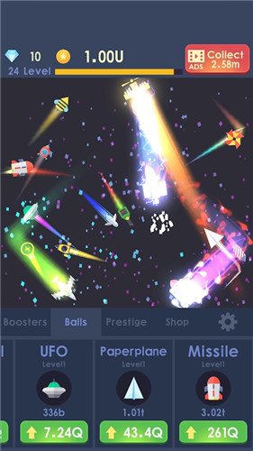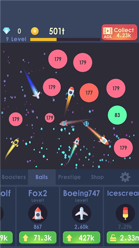 《放置火箭(Idle rocket)》是一款休闲类的点击游戏,玩家在游戏中防止火箭,点击屏幕来摧毁上面的各种小球,总的来说休闲的元素还是很多的。