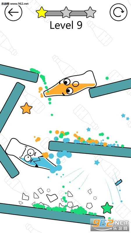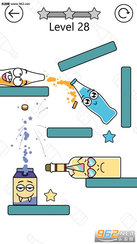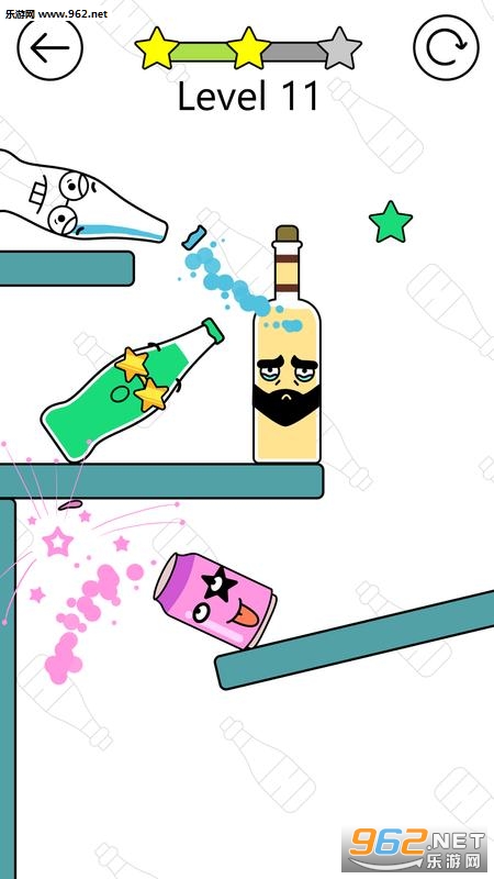 游戏的操作比较简单,但是随着游戏关卡的难度越来越高,就需要玩家仔细地观察瓶子和星星的排布,不一定要一根筋,灵活多变才能将星星全部击中!