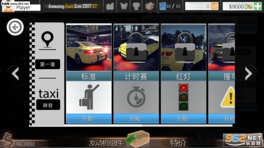 以在车库中详细配置汽车。除了在街道上自由移动以寻找乘客外,玩家还可以选择不同的模式。