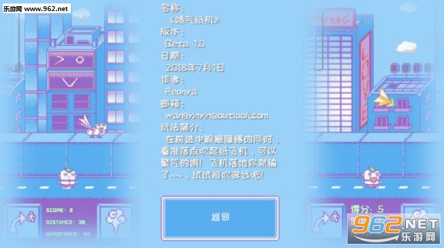 前进中躲避障碍的同时,看准落点吹起纸飞机,不要让飞机落地,可以聚气吹大力的哦!飞机落地你就输了~~试试能吹多远吧,祝好运!游戏通关后还有小小的惊喜等着你!