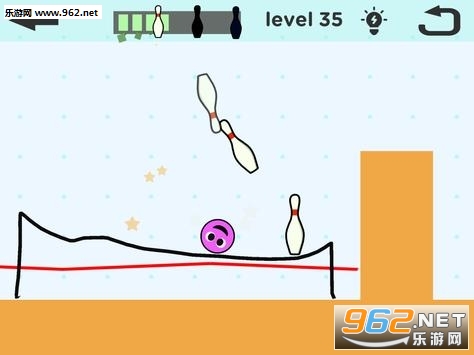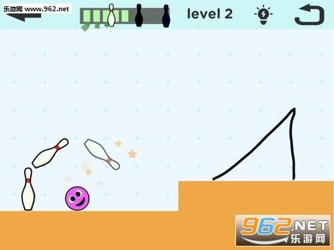 2、发散自己的思维,绘制更多的线条,准确的一笔让小球顺利击倒所有的保龄球。