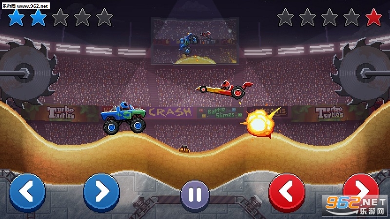 在竞技场上驾驶越野车、垃圾卡车和F1赛车。每种车辆都有自己的优胜劣势。游戏有三种模式:双人、单人,以及山丘之王比赛。