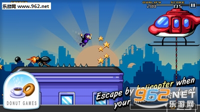 《城市忍者(Urban Ninja)》是一款卡通风格的横版闯关类游戏。玩家将扮演一个胖乎乎的忍者英雄,在城市中攀爬、跳跃、潜行。游戏玩法非常简单,用手指按住忍者,确定好方向后松手,忍者就会跳到指定的方向,注意不要碰到怪物哦,你的目的地是直升机!