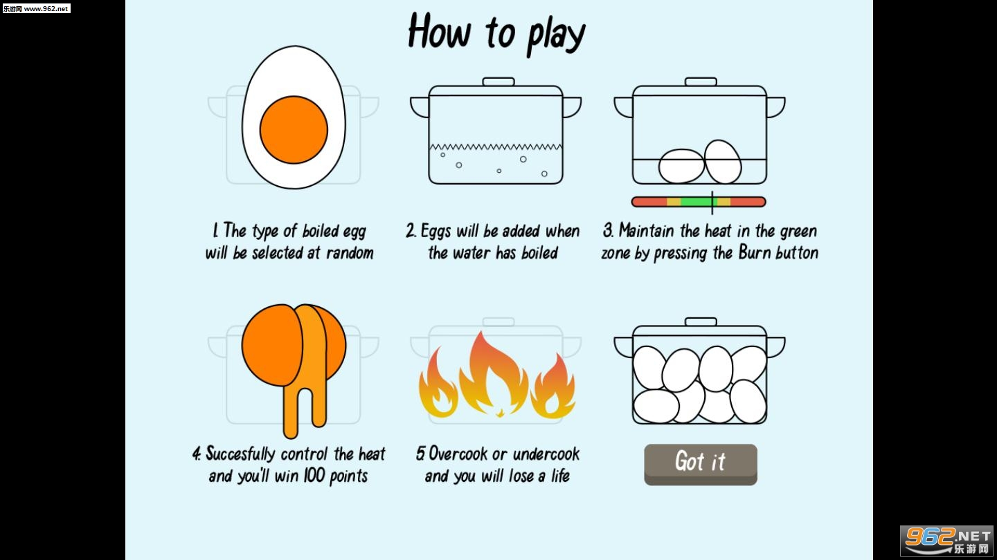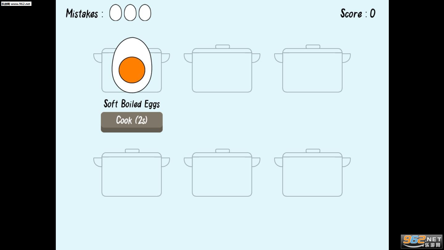这是一个看似简单的游戏,一开始你只是简单地煮一个鸡蛋,但很快你就会有更多的锅和鸡蛋,你无法管理!控制温度,看计时器,这并不像看起来那么容易!