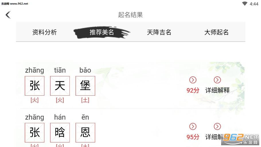 2.测名:一键查询您的姓名拼音、笔画、五行、喜用神、生肖、吉凶、等命理释义。