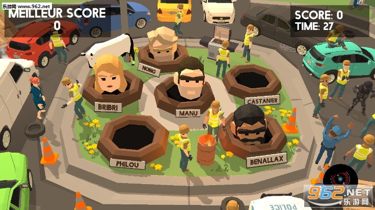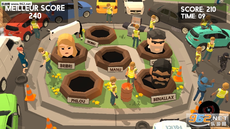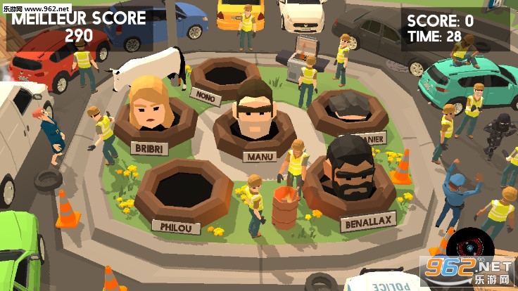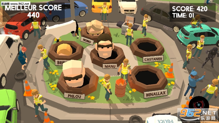《黄背心正义之锤手游》是一款很好玩的砸地鼠游戏,施工队现在要施工了,但是地上有很多的大坑怎么办,还时不时的有人头冒出来,那就用大锤子把人头都砸进去吧,点击屏幕,点击那里,大锤子就会砸向哪里,眼疾手快才是王道,砸中的次数越多得分越高。