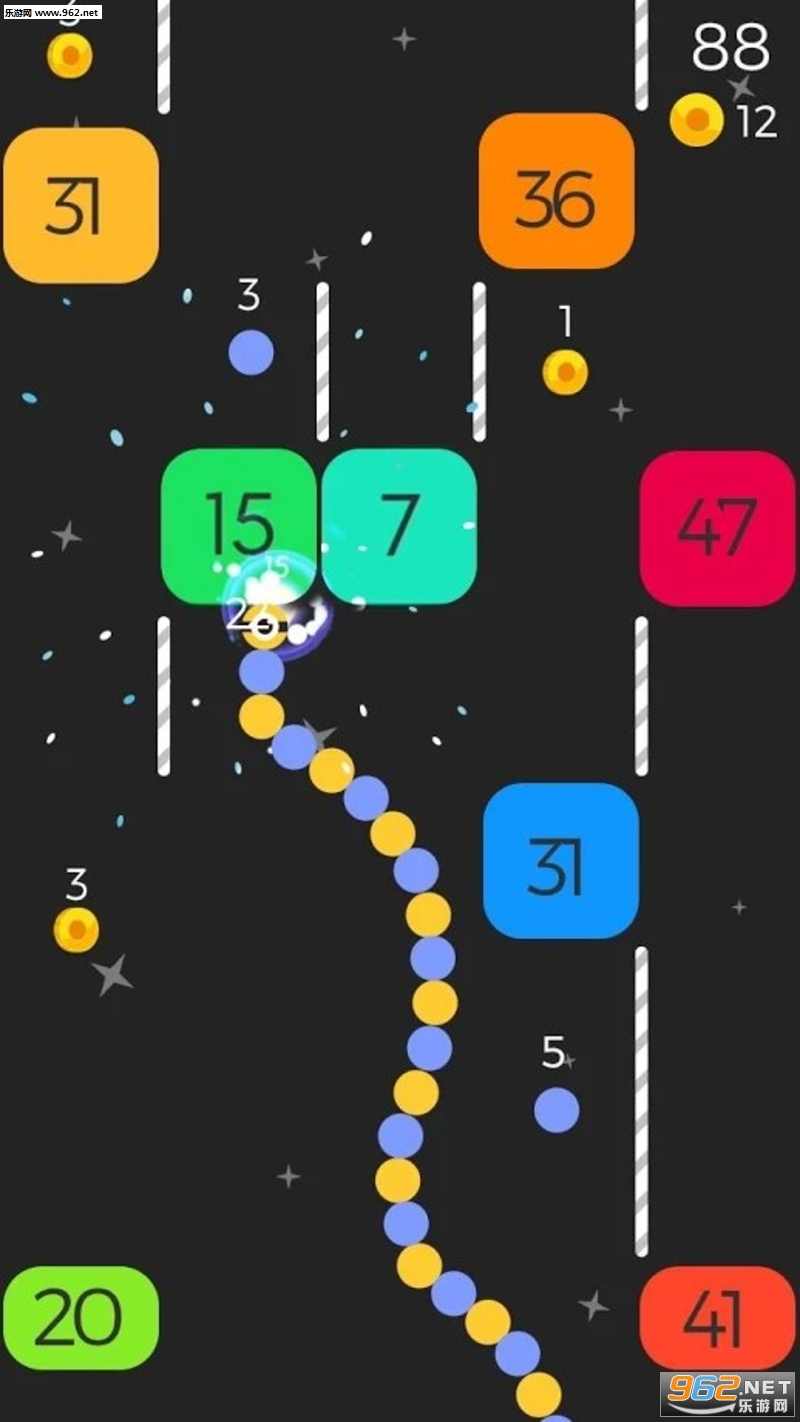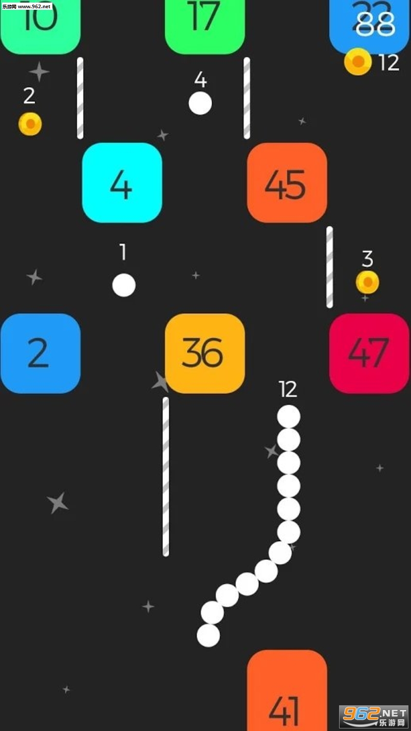 滑动手指引导一条由球组成的蛇,并将砖块打破。