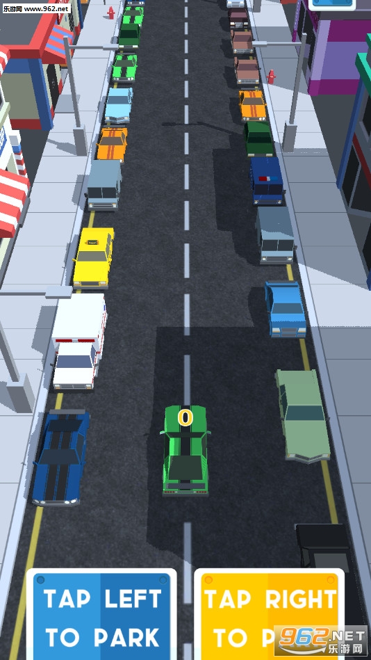 游戏的场景设定在道路两旁都停满车的街道,开始游戏后,屏幕下方会出现蓝色和黄色的两个按钮,分别显示“点击左侧进行停车”和“点击右侧进行停车”,玩家第一次点击之后,这两个按钮就会消失。在开始游戏之后,玩家控制的车辆就会在马路中央不停的向前奔驰,这时左右两侧的停车道会随机出现空位大小不同的空车位,根据出现车位的方向,点击屏幕下方的左侧或右侧即可完成停车。