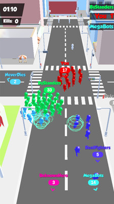 极具魔性的游戏设定,看似清新的主题城市氛围,具有一定的挑战性,多人在线实施对战,真人玩家实力pk,玩家需要把分散的人群组合到一起,扩大自己的队伍,跟来自不同地方的玩家展开对战,玩家需要在最短最快的时间内聚集人群,去攻击和吞噬其他玩家,获取最后的胜利。