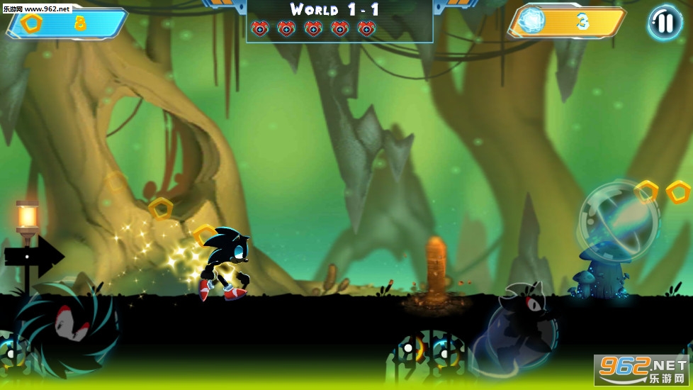 《超级声波阴影运行安卓版》是一款画面暗黑的以索尼克为题材打造的横版跑酷手游,游戏中玩家将控制索尼克在各种不同的关卡中冒险,可以跳跃和下滑,小心随时出现的木桩、锯齿等陷阱,碰上就会死亡,合理利用关卡中出现的道具。