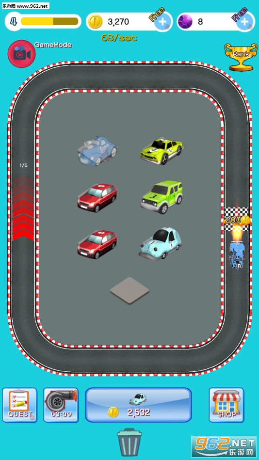 《合并竞赛安卓版》(MergeRace)是一款画面清新的合并放置类休闲手游,游戏中玩家可以花费金币来购买一些汽车,可以将相同的两辆汽车合并获得一辆新的汽车,以此往复,获得越来越多的新车,将新车放入旁边的轨道每行驶一圈可以获得一定的金币。