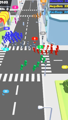 1.整个游戏的画风都是3D的感觉,刚开局的一个人,奔跑在这个城市中,你将获得更大的人群;