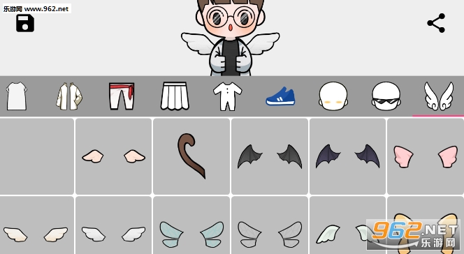 非常可爱,装饰品更多:肤色,高级服装(衬衫,裤子,裙子,鞋子),头发,脸,翅膀,贴纸,配饰,眼镜......