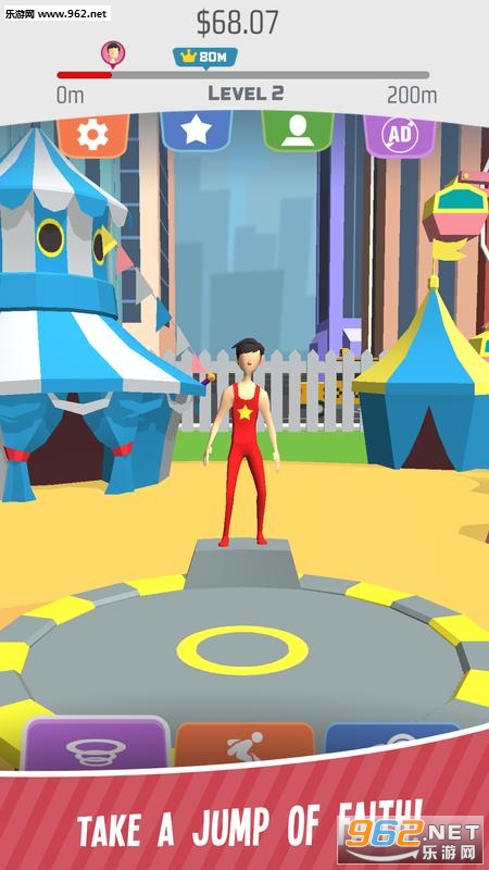 非常有趣的跳跃休闲手游,以蹦床为核心,挑战玩家的手眼协调能力,你需要选择合适的时机以正确的姿势进行跳跃,获取更高的分数。