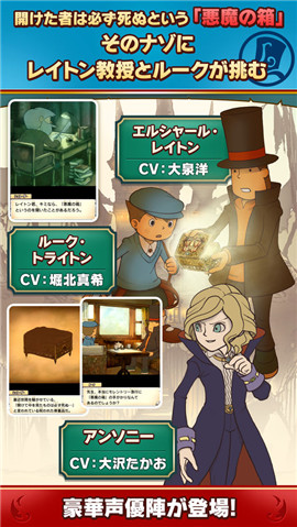 《雷顿教授与恶魔之箱安卓版》是一款2D漫画风格日系卡通题材角色扮演类游戏。在游戏中,玩家将前往一个奇幻的世界,你将扮演一个类似于侦探的角色,推理并破解一个又一个可怕又有意思的阴谋。