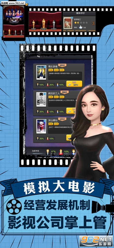 《模拟大电影手游》是一款十分好玩有趣的休闲策略模拟经营类游戏。玩家在游戏将模拟明星拍电影,赚取酬劳。同时你还可以培养明星成为制片人或者导演,玩法多种多样。游戏的玩法与票房大卖王很像,只不过更加的耐玩,感兴趣的小伙伴儿不妨来下载试试吧!