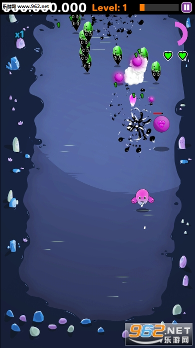 你从奖金盒中收集口香糖道具来增加你的火力。当你射击时,火力会变弱,直到你找到更多的口香糖,因此在弱射击和强力击球之间有一种非常好的动态。你还会拿起泡泡糖弹,自动膨胀和开火。你通过用炸弹击中敌人得到的组合,建立得分“乘数”。乘数是一个与您的点相乘的值。每次玩游戏时,敌人的移动模式都是独一无二的,所以新游戏将永远不会相同。