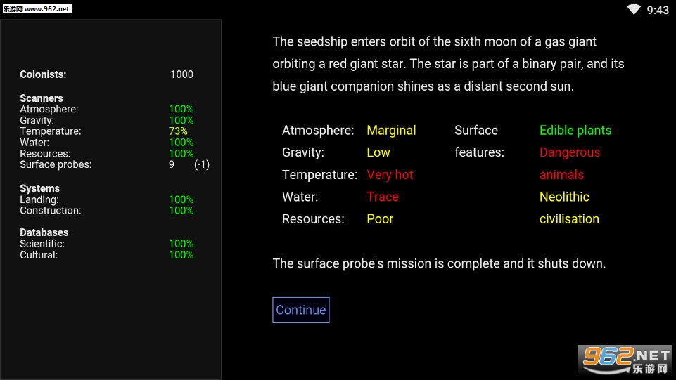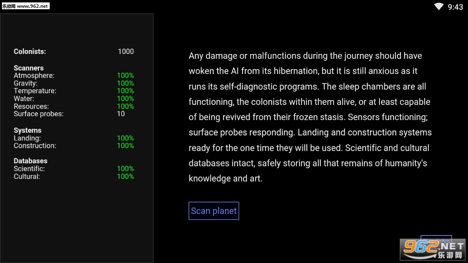 玩法很简单,玩家作为人类最后希望“seedship”上的AI来做出各种决定。信息栏分两块,飞船信息包含探测器、乘客舱和系统数据库,另一栏显示星球情况和突发事件。选择星球建立殖民地后会根据飞船状态和星球情况打分。