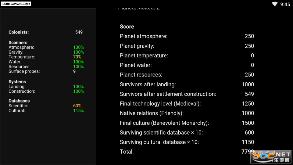 殖民者们最终建立的新社会将会附有简单介绍,按我目前的结果4000分左右是奴隶等级社会,9000分左右是自由平等国家,上万基本是快乐乌托邦。现在我的十次游戏都得到了不同结果。