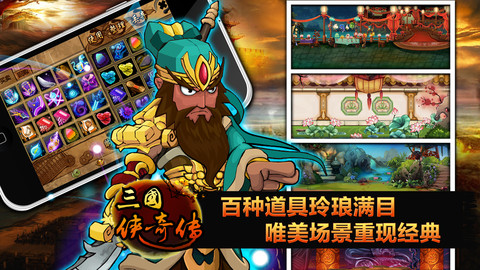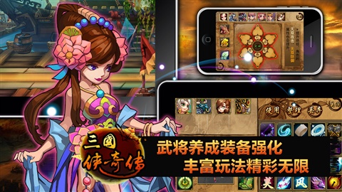 北方小镇、西凉大漠、帝都洛阳、虎牢汜水、烟花扬州、古都长安等各色场景可以由您任意穿梭和探索,数百个副本地图等您挑战与征服。您将穿越在三国乱世的名胜古城,控制历史的大潮,书写属于自己的三国传说。精细唯美动漫卡通 唯美风格的漫画场景,卡通Q版的人物造型,多彩多姿的华丽服饰,潇洒流畅的招式武功,可爱调皮的人物表情,让您领略不一样的萌动三国。
