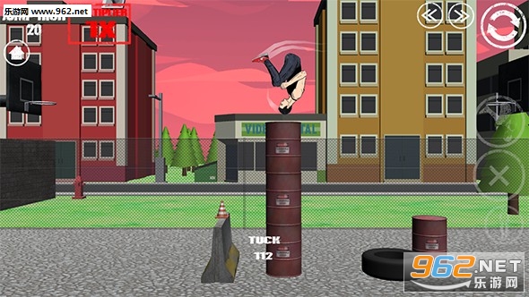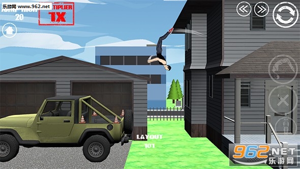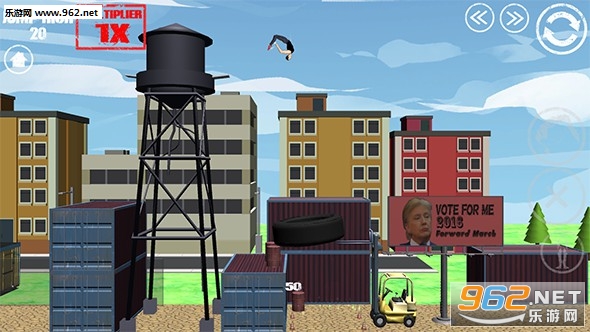 一款魔性游戏,玩家需要控制角色,让他完成后空翻,并且落到指定位置。为了完成目标,你需要高超的操作技巧。右边的按键可以切换空翻的姿势,合适的姿势搭配高超的操作才能成功。